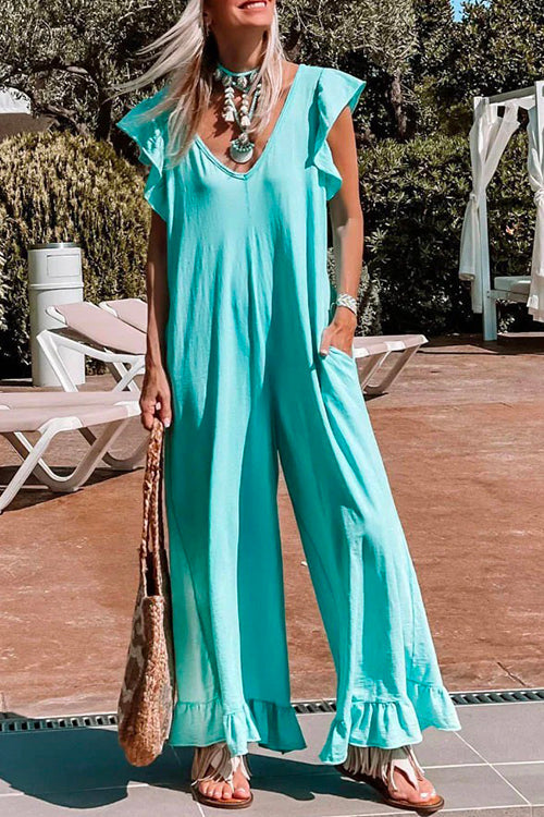 V Neck Ruffle Hem Pockets Slouchy Jumpsuit