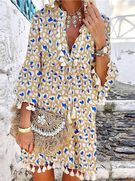 Tassel Beach V Neck Vintage Floral Print Dress
