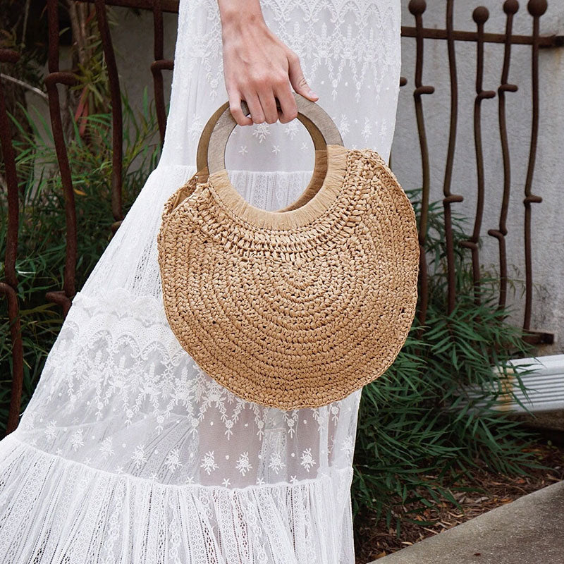 Boho Bag, Woven Straw Rope Bag, Rattan Bag, Yellow Moon Tassel in Brown and Ivory