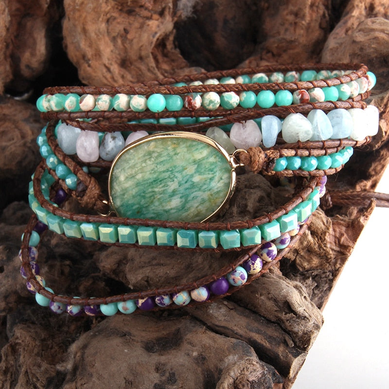 Boho Bracelet, RH 4 Layers Leather Wrap Bracelet, 4 mm Armbander Black Blue Natural Stones