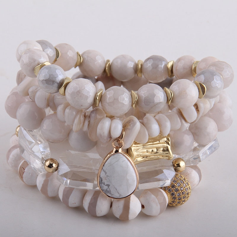 Boho Bracelet, RH Bracelet Set, Cubic Zircon Ball, Natural Stones,  in Black and White