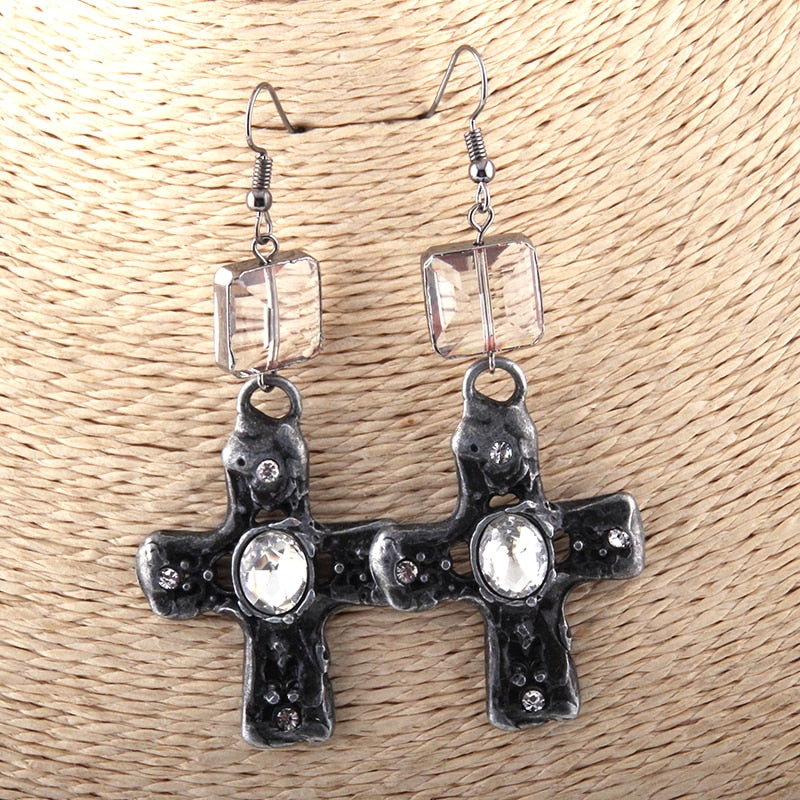 Boho Earrings, RH Dangle Earrings, Silver Metal Cross