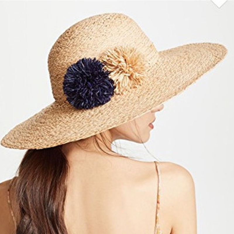 Boho Hat, Sun Beach Hat, Raffia Fedora Hat, Navy Pom Pom