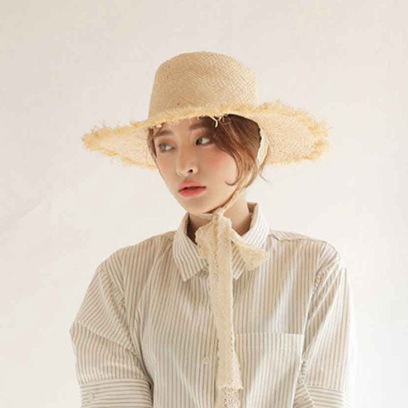 Boho Hat, Sun Beach Hat, Vintage Raffia Straw Hat Leah Lace Ribbon
