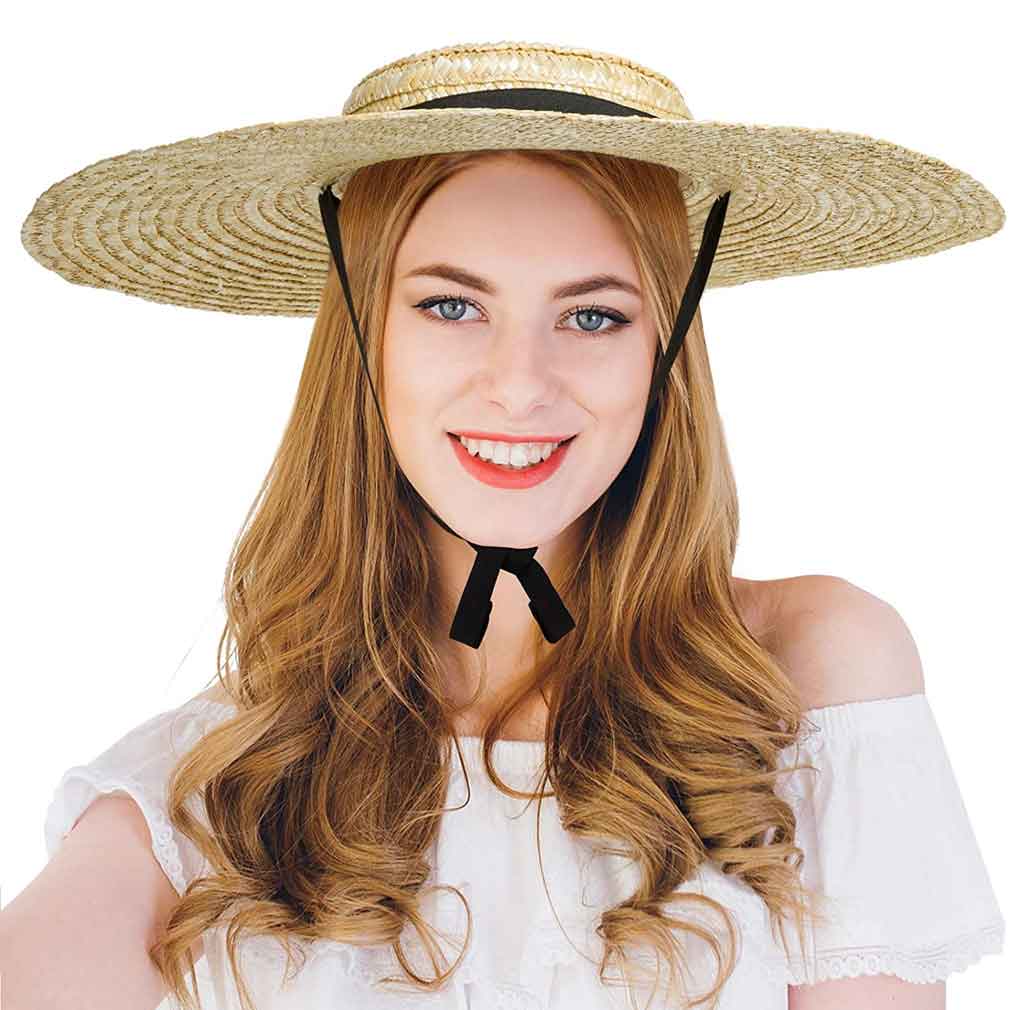 Boho Hat, Sun Beach Hat, Wide Brim Straw Hat 12 cm, Flat Top Black, White Ribbon