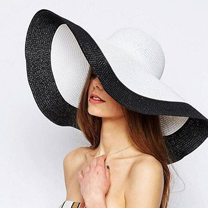 Boho Hat, Sun Hat, Beach Hat, Extra Wide Brim Straw Hat (25 cm), Two Tone Black White