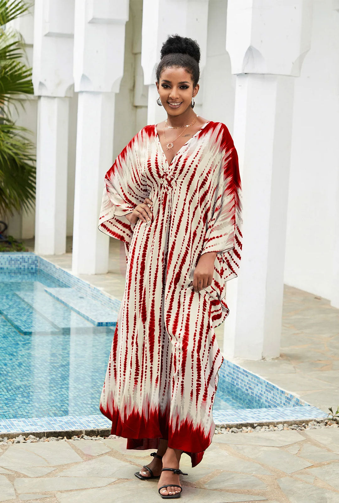 Boho Maxi Dress - Beach Dress, Kaftan Dress Vintage Embroidered in Danica Tie Dye Red