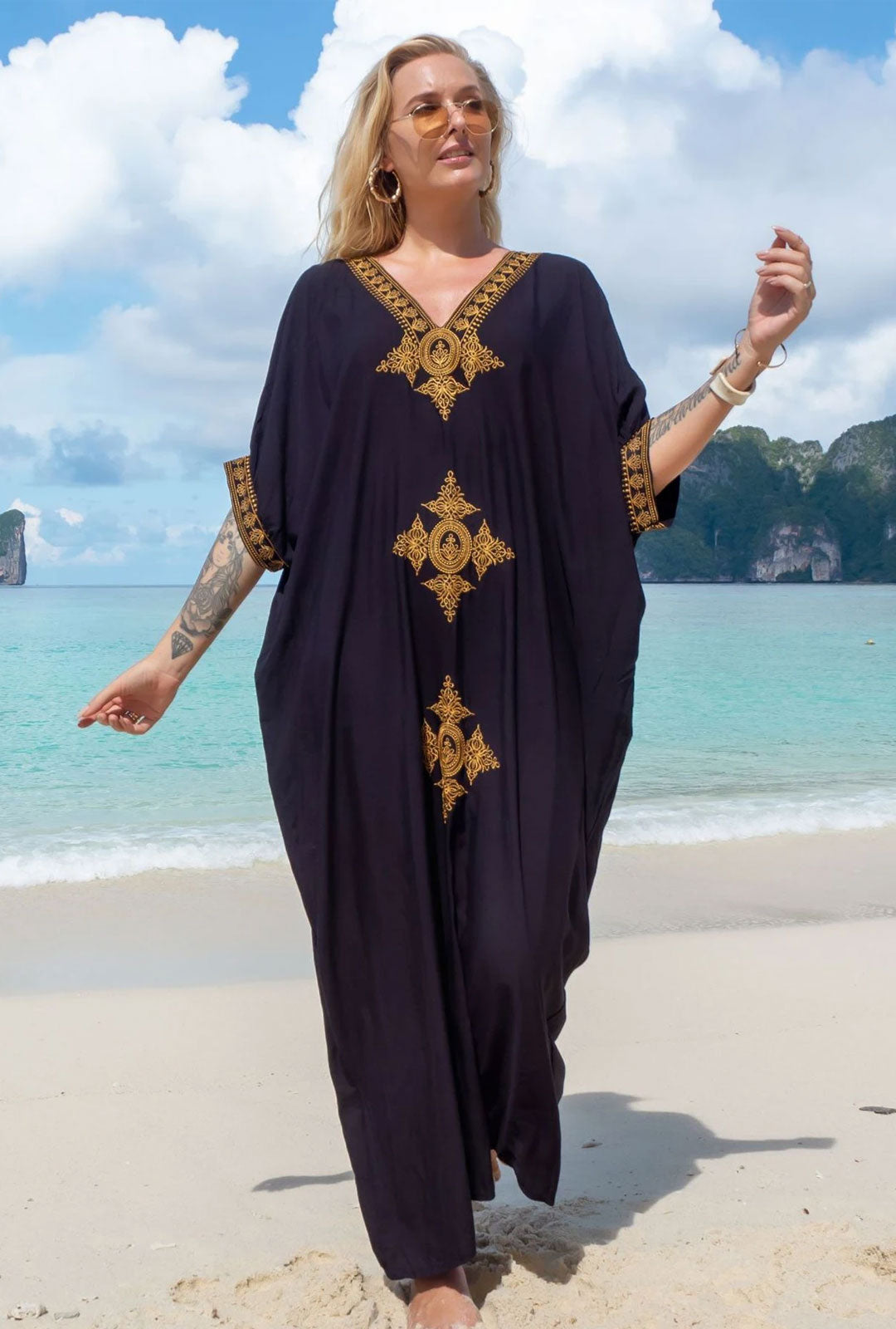 Boho Maxi Dress - Beach Dress, Kaftan Dress Vintage Embroidered in Black Liliana