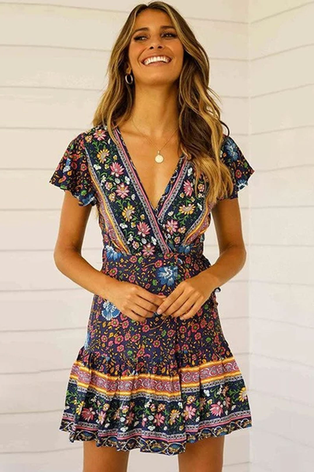 Boho Mini Dress, Sundress, Wrap Dress, Urban Flow in Navy and Red