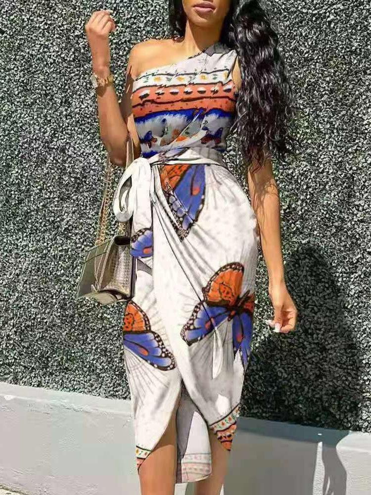 • Feature: Oblique Shoulder. Butterfly Print. Sleeveless. Irregular Dress