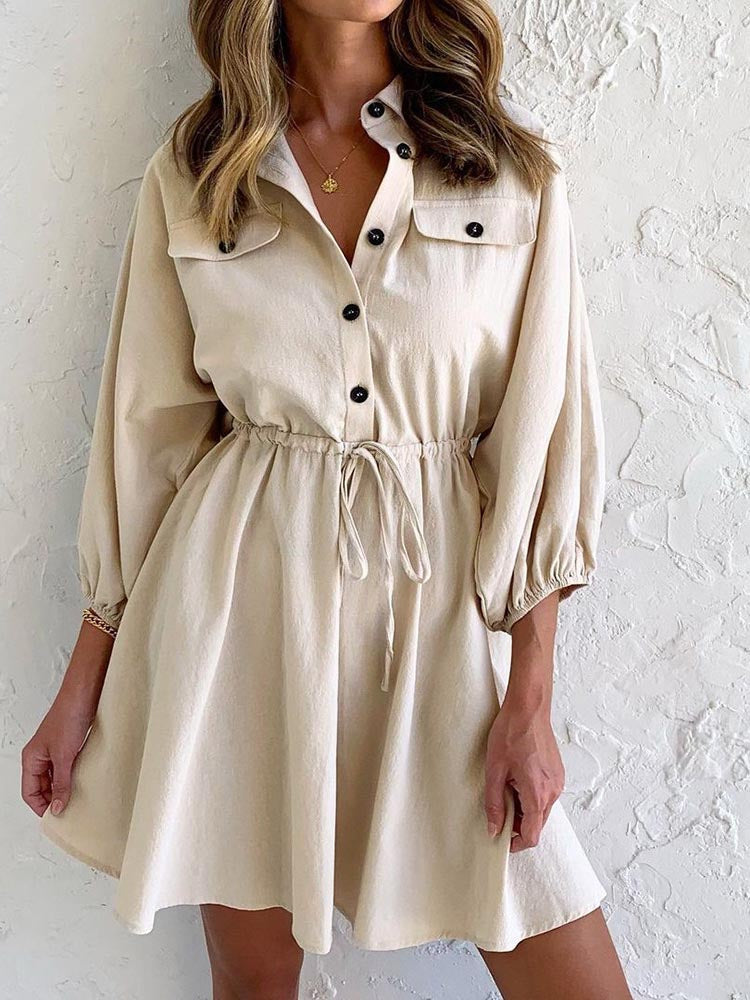 Button Up Drawstring Waist Long Sleeve Mini Dress