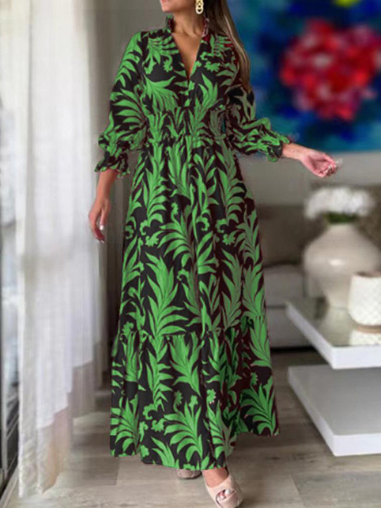 Casual Long Sleeve V Neck Floral Maxi Dress