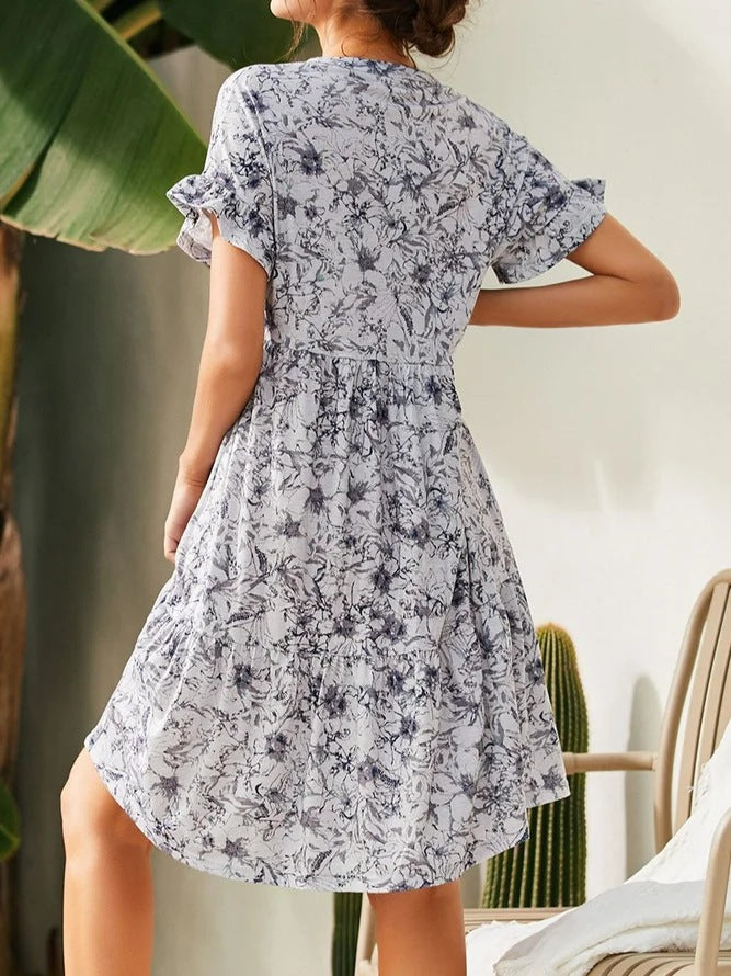Casual Short Sleeve V-Neck Printed Loose Midi Dress