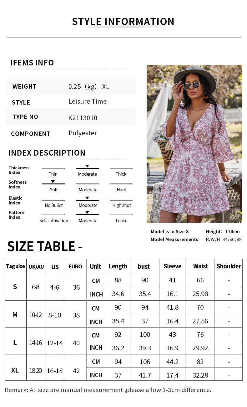 • Features: V-neck. 3\4 sleeve. printed. fashion mini dress