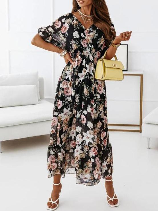 Cross V Neck Elastic Waist Floral Short Sleeve Maxi Dress