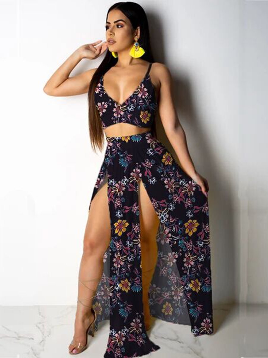 Deep V Neck High Split Maxi Dresses Skirt Set