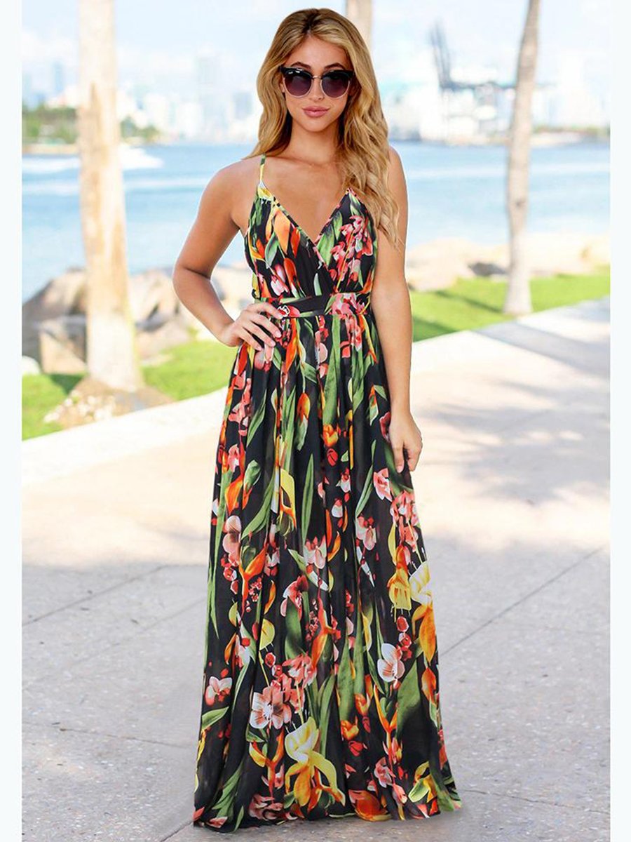 Deep V Neck Floral Adjustable Spaghetti Strap Sleeveless Dress