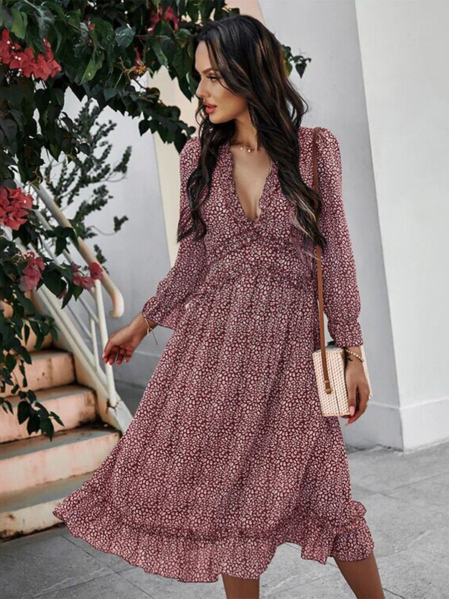 Deep V Neck Floral Long Sleeve Ruffle Hem Maxi Dress