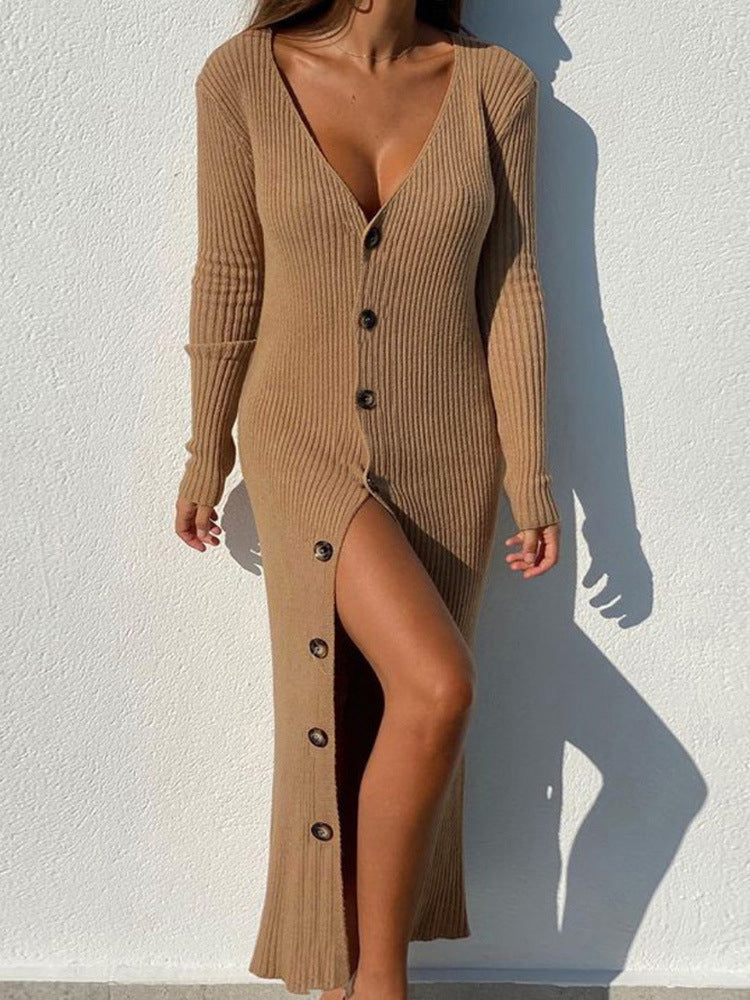 Deep V-Neck Long Sleeve Button Maxi Dress