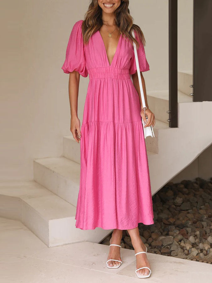 Deep V-Neck Short Sleeve Solid Color Maxi Dress
