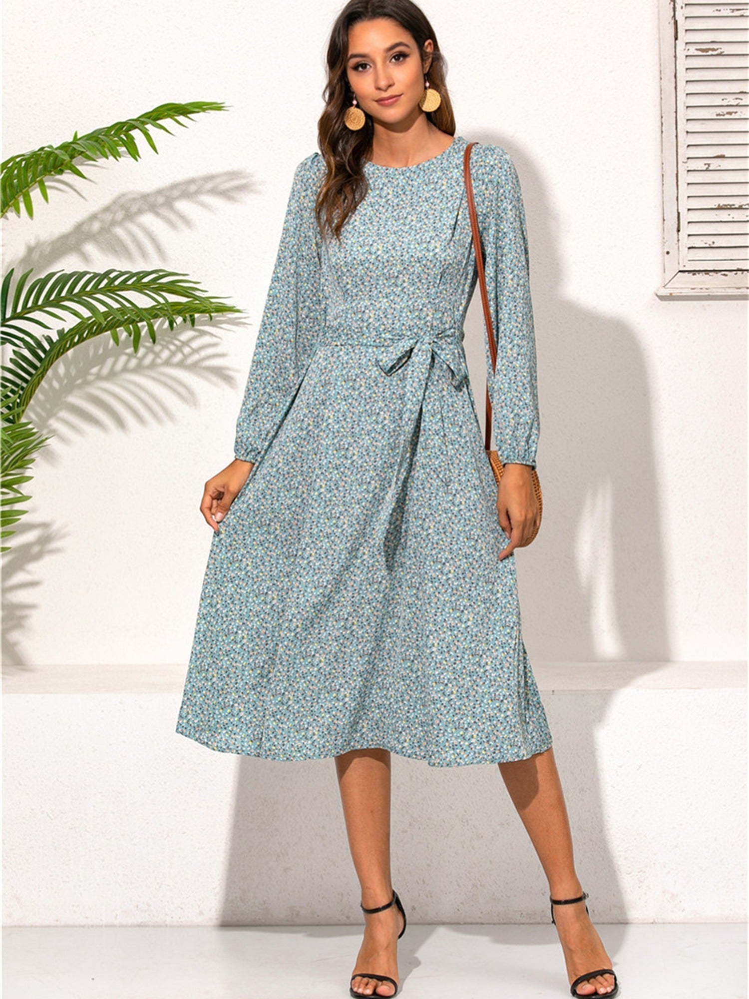 Casual Ditsy Floral Print Long Sleeve Midi Dress