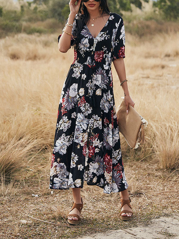 Elegant Deep V Neck Short Sleeve Floral Maxi Dress