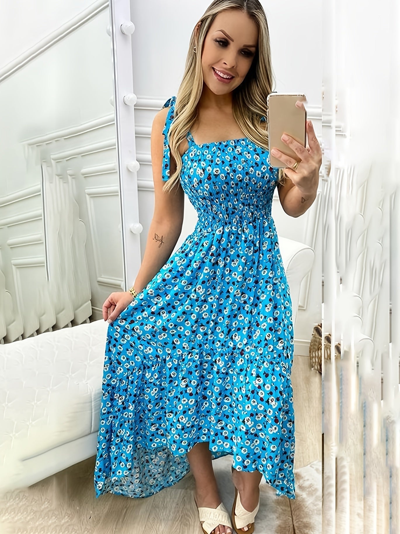 Floral Print Asymmetrical Color Block Spaghetti Strap Maxi Dress