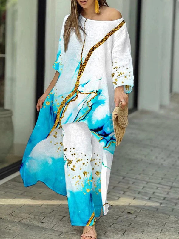 Offshoulder Printed Low High Loose Blouse Top Pants Set
