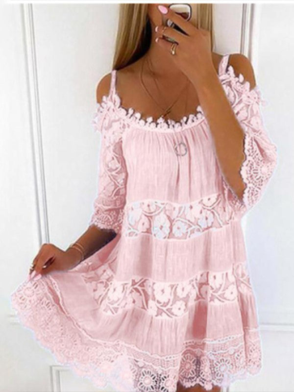 Material: Made of high quality material Description: 3/4 Sleeve. cold shoulder. lace lined. scoop neck. mini dress Occasion: Suitable for any occasions.
