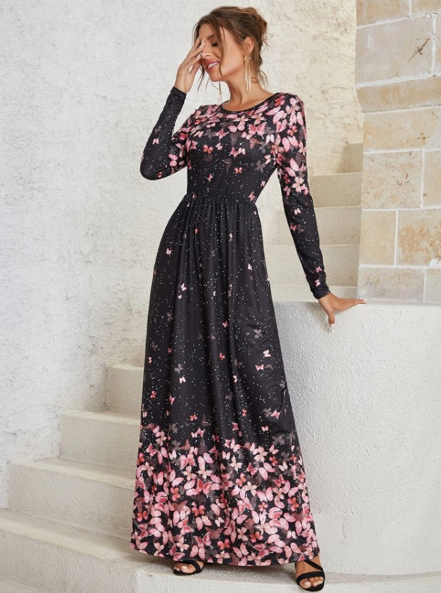 Fashion Floral Print Long Sleeve O-Neck Maxi Dress