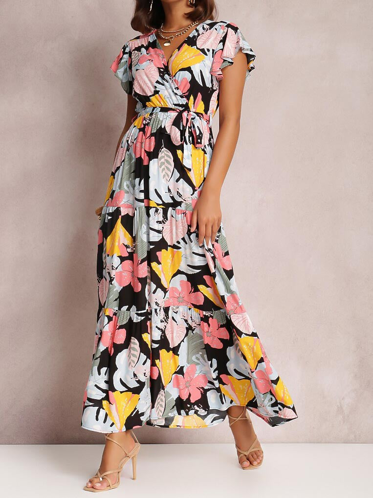 Floral Long Sleeve Cap Sleeve V Neck Maxi Dress