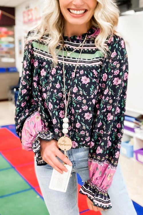 There are so many beautiful details on the Exquisite Beauty Floral Blouse! The bright pink flowers against the blue background pop and compliment the stripe of pink on the sleeves. This stunning top has a high neckline with multicolored detail and a balloon sleeve with an elasticated ruffle cuff at the wrist. Pair this top with a wide leg pant for a retro look.