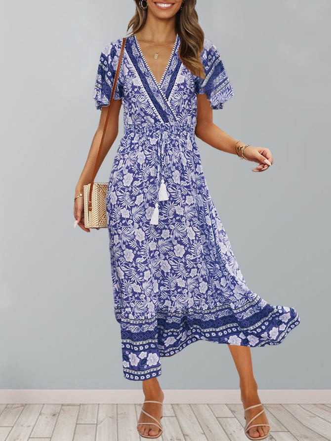 Floral V Neck Short Sleeve Midi Dress