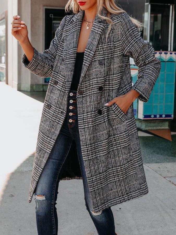 Big Notch Lapel Collar Wool Blend Plaid Long Peacoat Trench Coat