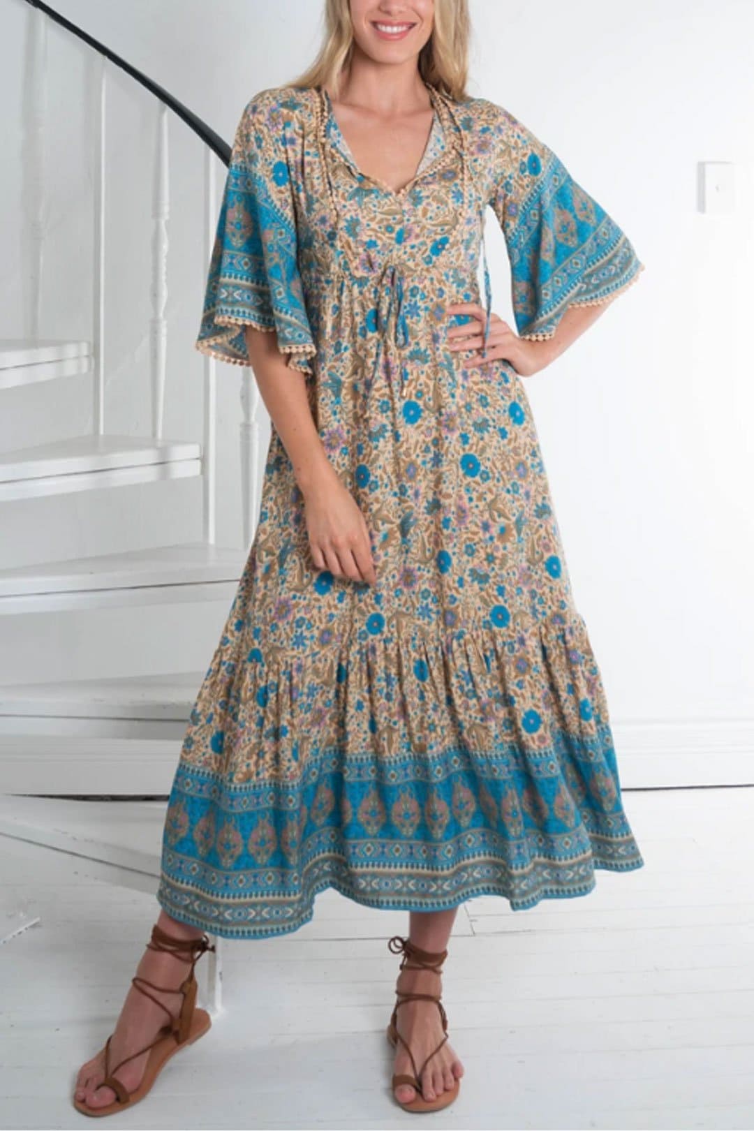 Boho Midi Dress, Sundress, Kaftan Dress, Indian Flower in Blue
