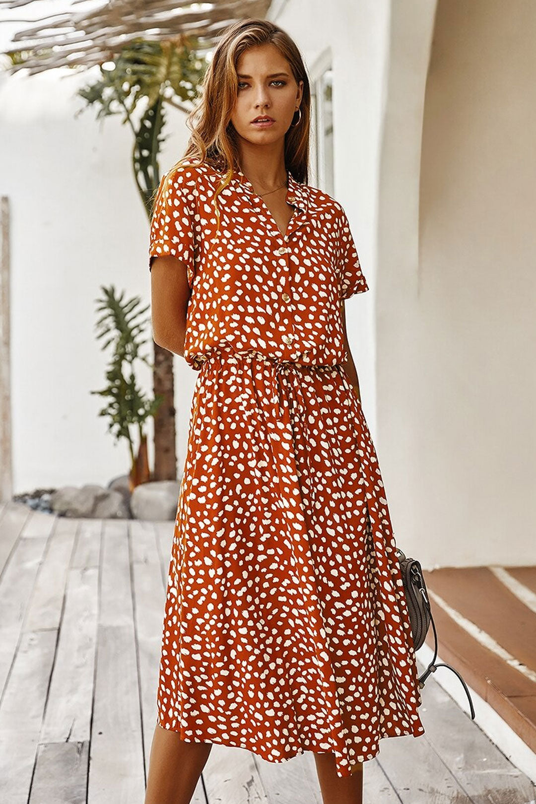 Boho Midi Dress, Sundress, Quinn Polka Dot in Orange Brick