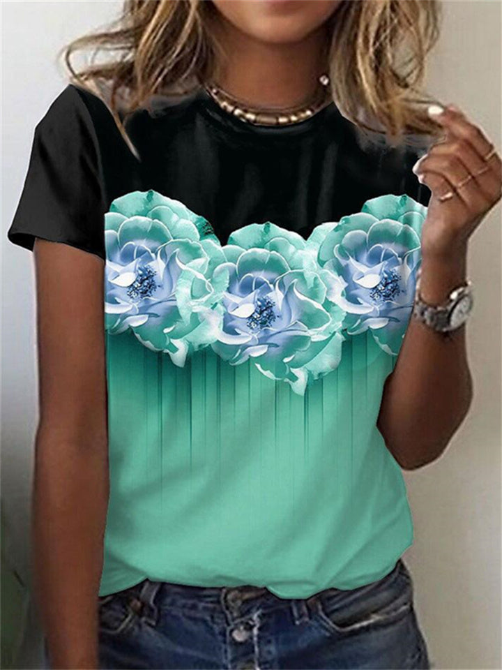 New Gradient Color Floral Colorblocking Positioning Print Women's Round Neck Short-sleeved T-shirt Urban Casual Tops