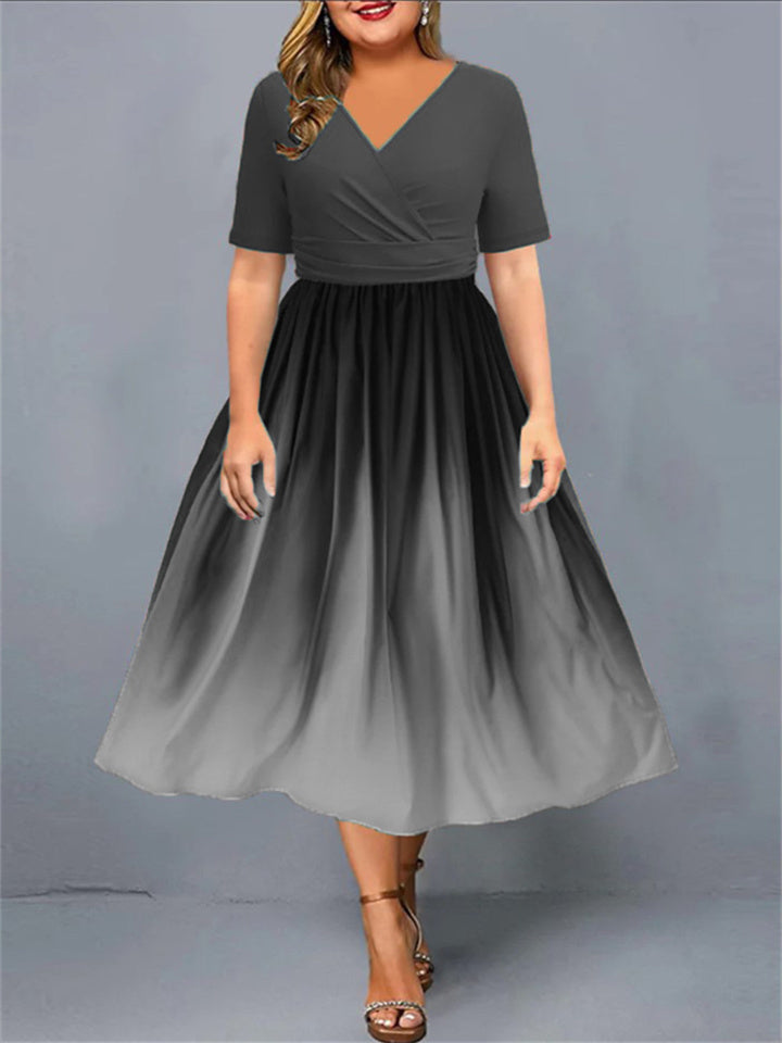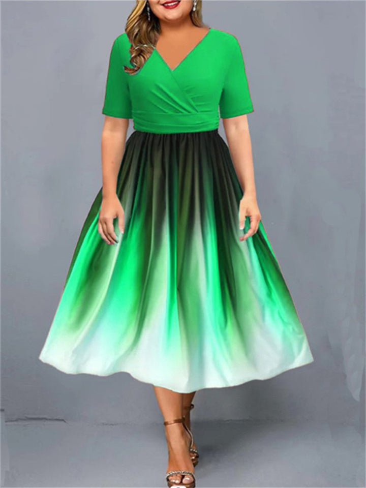 New Gradient Print Party Dress Short-sleeved V-neck A-line Dress Large Hem Elastic Waist Mid-length Dresses Women