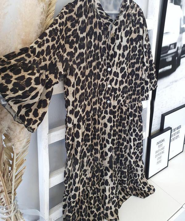 Leapin' leopards! We've been searching for a dress this awesome—and ta-da! Here is it is. Designed in the print and silhouette of the season. this leopard dress has a button-up bodice. cropped bell sleeves and a tiered skirt that falls past the knee. Equally cute with slippers or heeled mules.