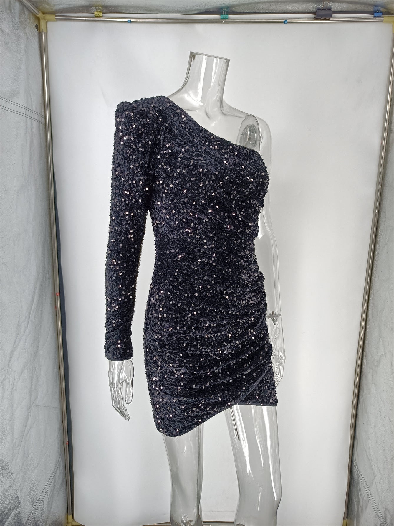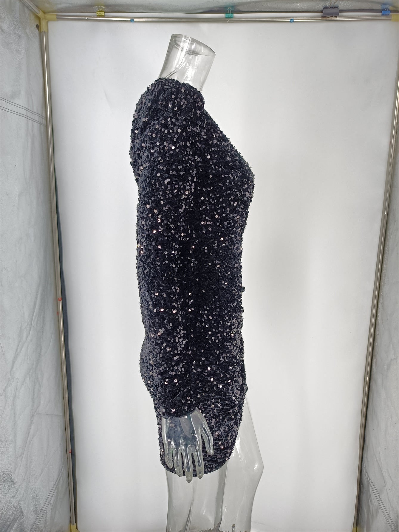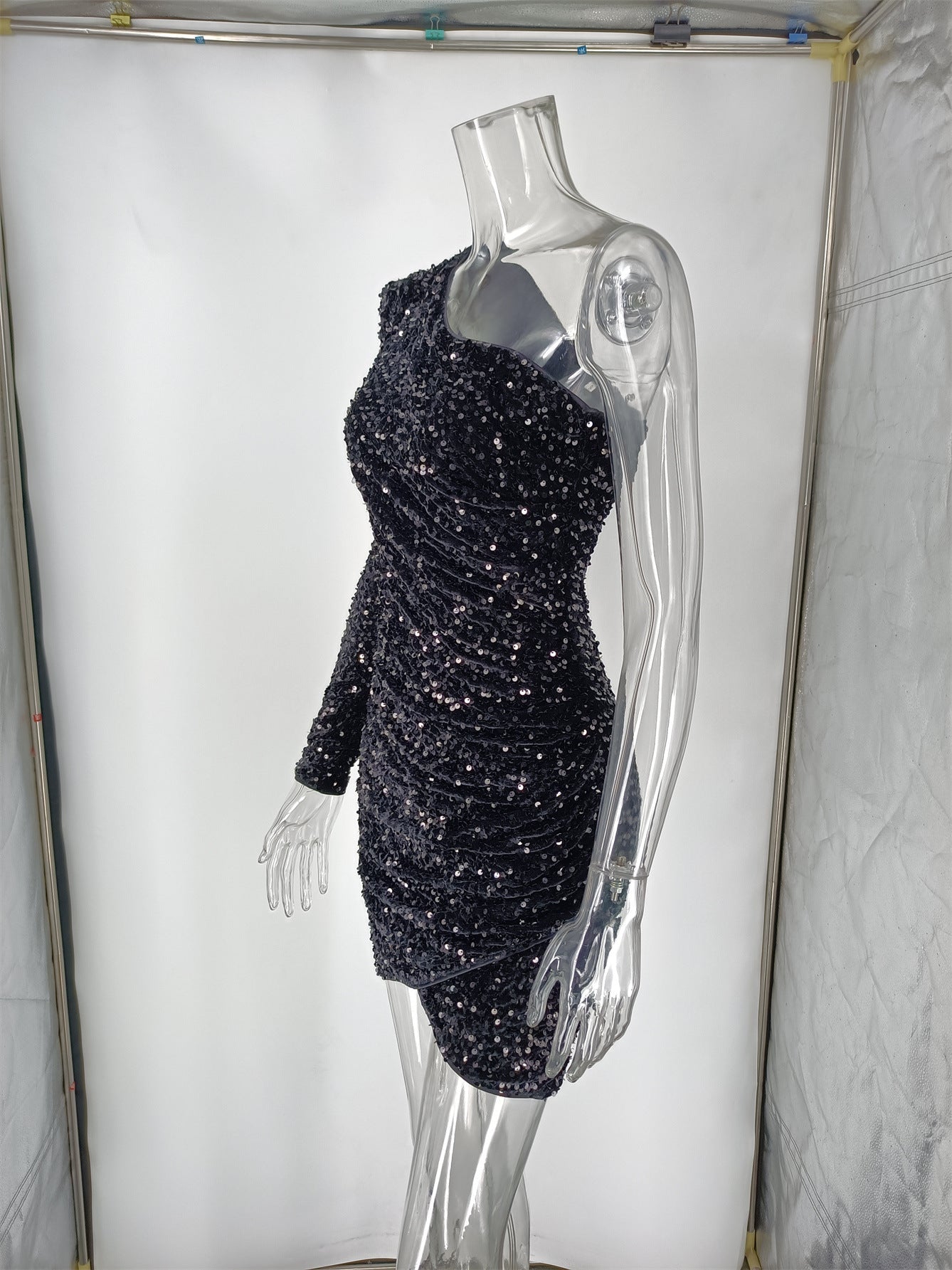 One Shoulder Long Sleeve Sequin Mini Bodycon Dress