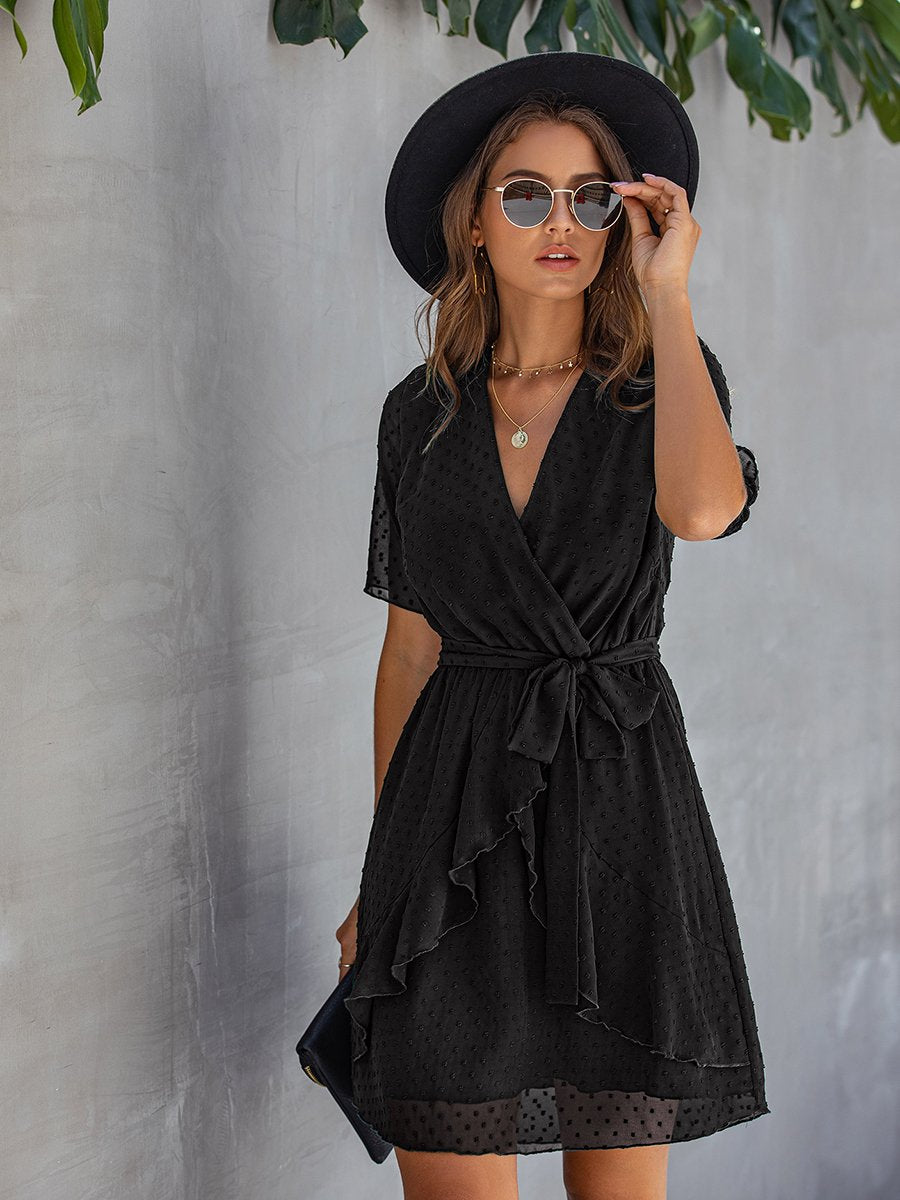 Features: women's ruffles dress.see through Long Sleeves.allover with 3D polka dots.sexy v neck.basic solid color dresses.fully Lined.inside moderate elastic waist.classic A-line and high waist.casual summer dress.