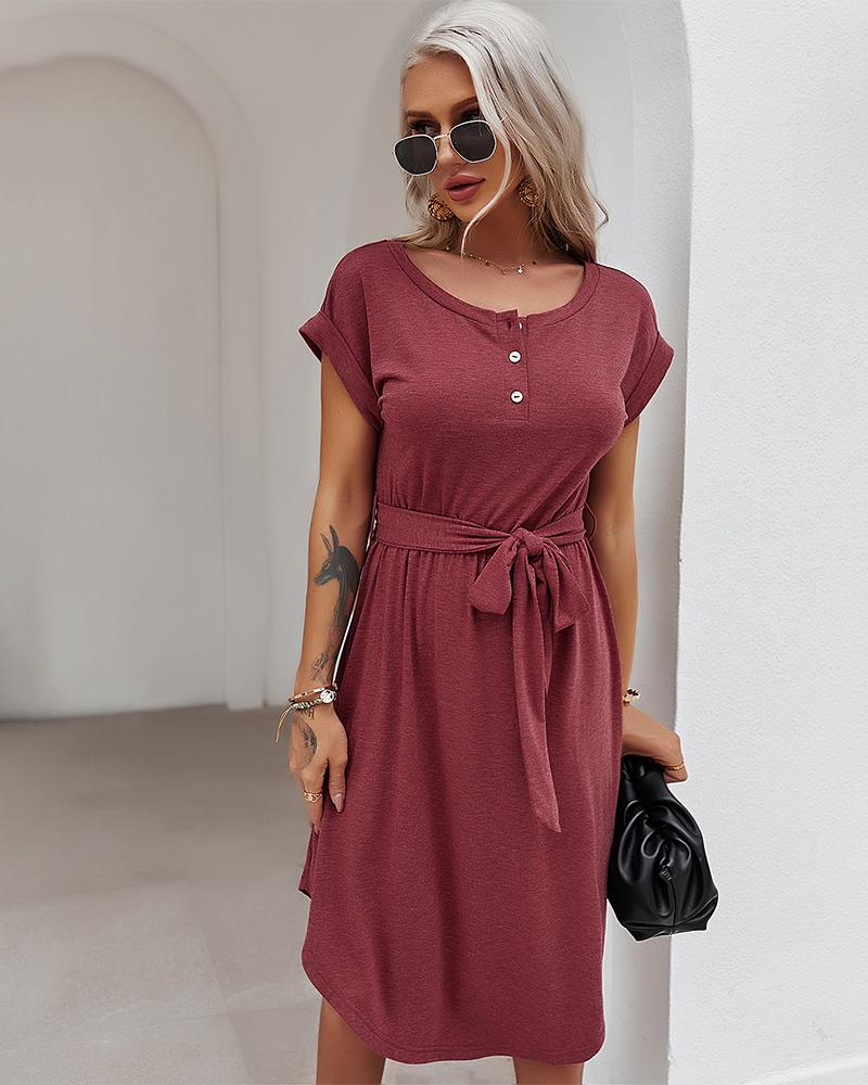 Round Neck Short Sleeve Waist Tie Midi Dress