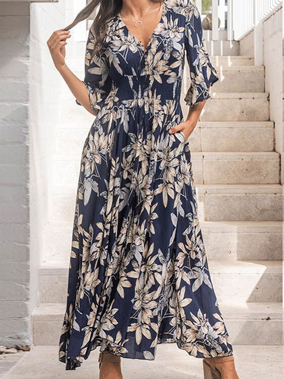 Ruffle Short Sleeve V Neck High Waist Floral Maxi Dress
