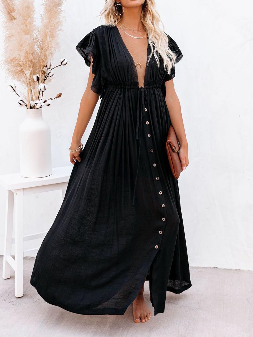 Ruffle Sleeve Deep V Neck Button Down Wide Maxi Dress