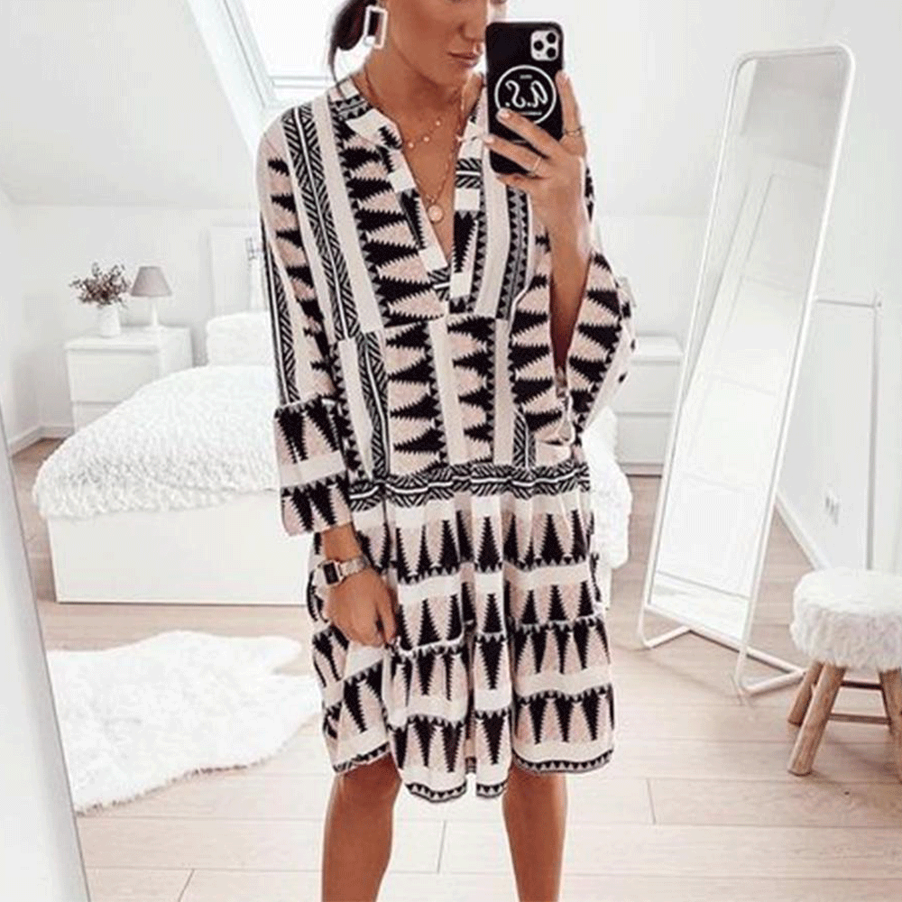This dress is cut from lightweight fabric with a geo print inspired by ikat dying. Ita??s fashioned with a split neckline and cropped bell sleeves. Subtle gathering at the lower half gives the A-line dress a touch of movement. We especially like it with frontal hoop earrings and block-heel sandals.