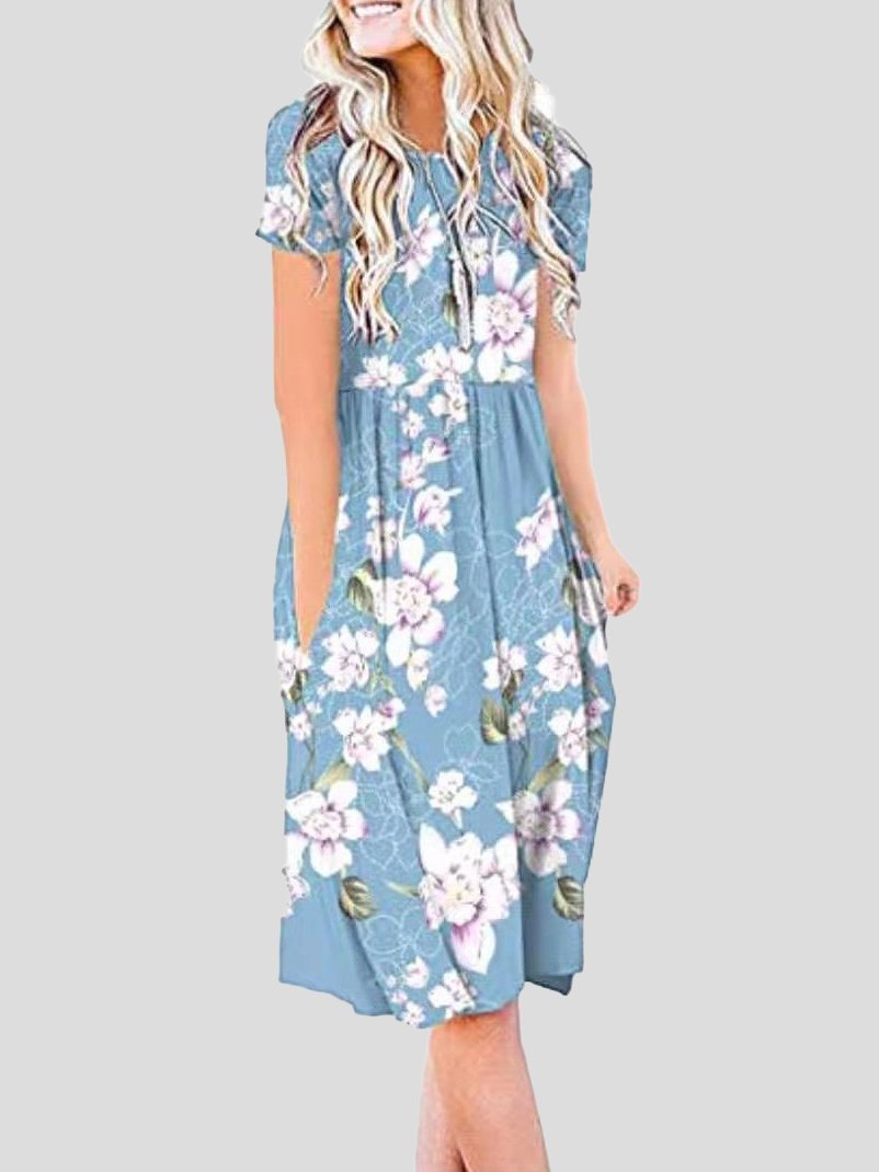 Short-sleeved Floral Print Mid-waist Midi Dress