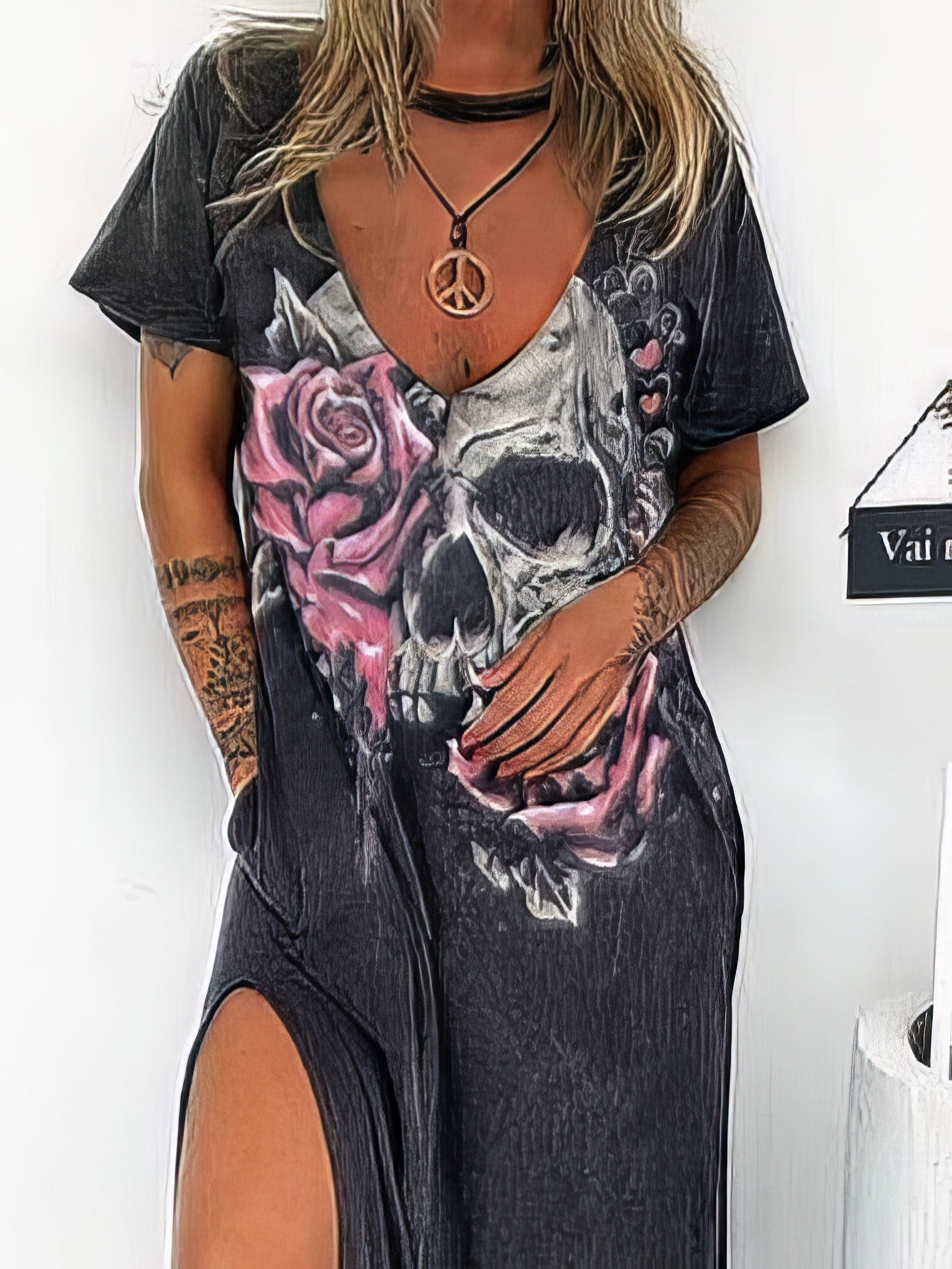 Make a statement with this Skull Print V-neck Short Sleeve Loose Slit Dress. Crafted from lightweight fabric. this dress features a V-neckline with short sleeves and a loose fit. decorated with a bold skull print for an edgy look. The side slit adds movement to the design.