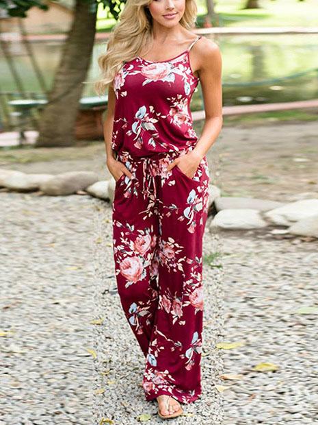 Sleeveless Spaghetti Strap Tie Waist Floral Jumpsuit