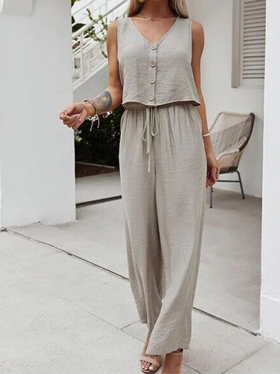 Sleeveless V Neck Button Top with Pants Set