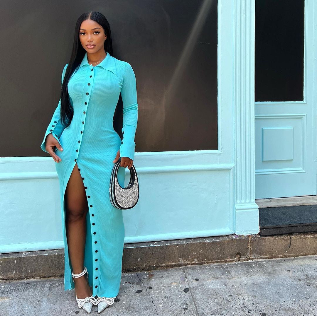 Solid Color Collar Button Down Long Sleeve Slim Split Maxi Dress